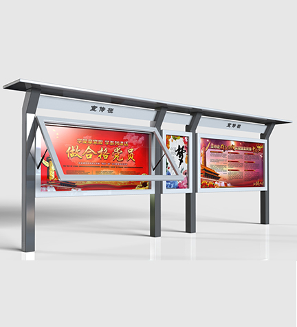 生活中的宣传栏是我们生活文化的重要组成部分,可以通过张贴海报、报纸等方式向人们传递信息,是生活文化中不可缺少的元素之一,宣传栏也是一种VI应用,是组织或企业单位等进行自我宣传的有效手段,常被应用于街道,工厂,酒店等公共场所;一般采用不锈钢为框架,钢化玻璃或者耐力板为面板,铝合金为顶棚,面板可以打开更换宣传画面。